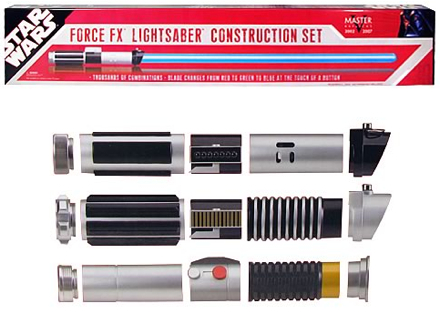 “To be a Jedi, you must construct your own lightsaber. Finding the right crystals and metal pieces to forge your own weapon can be difficult, but the Star Wars Force FX Lightsaber Construction Set makes it easy for you. In just seconds, you can assemble 5 pieces, a blade, and some batteries to forge one of over 700 possible configurations of lightsaber! Use a variety of pommel, handle, and detail parts to create a personalized weapon that looks just like the ones that belong to Luke Skywalker, Darth Vader, Anakin Skywalker, or Obi-Wan Kenobi… or something totally new that’s uniquely you!”[via slashfilm]